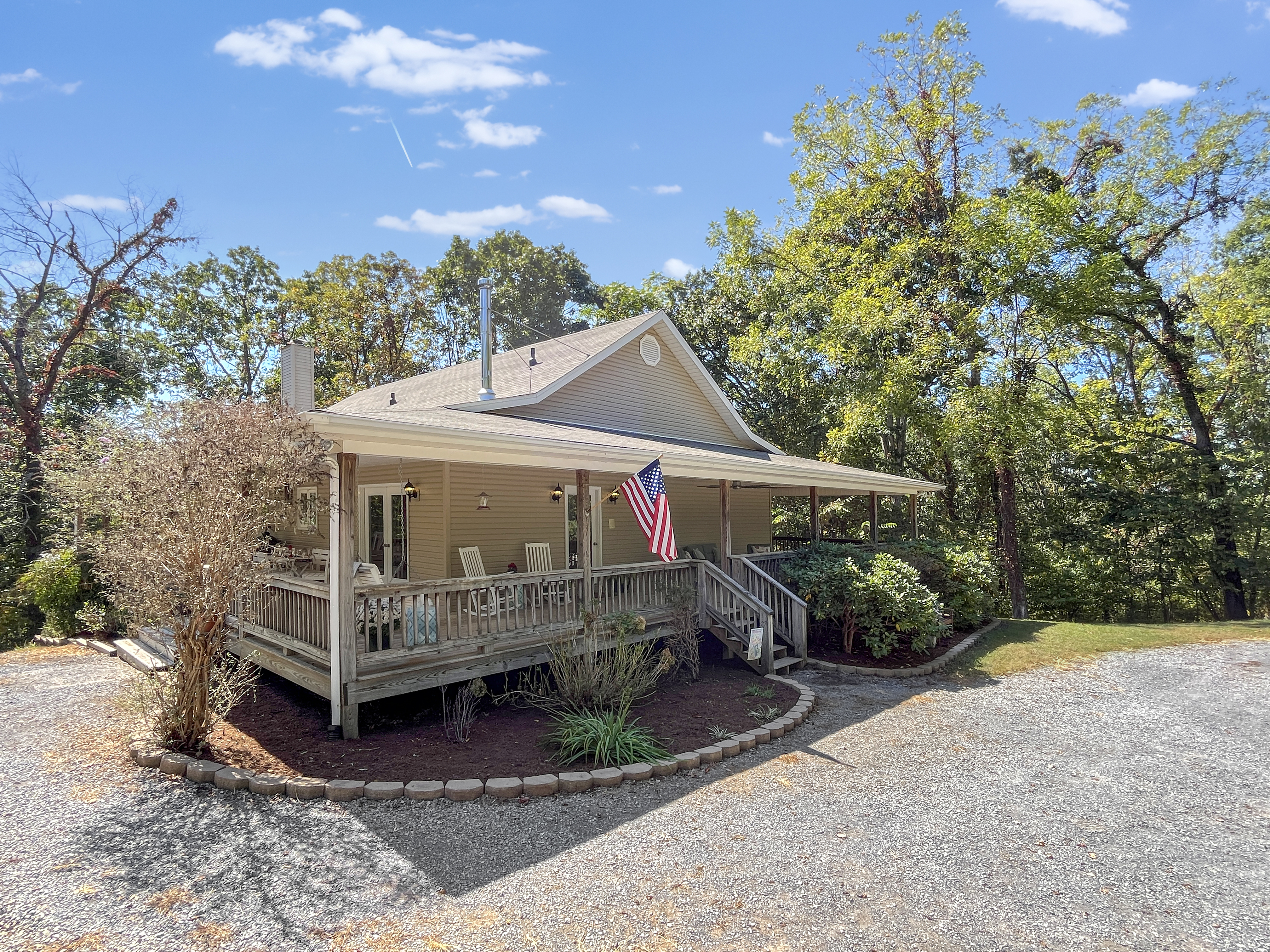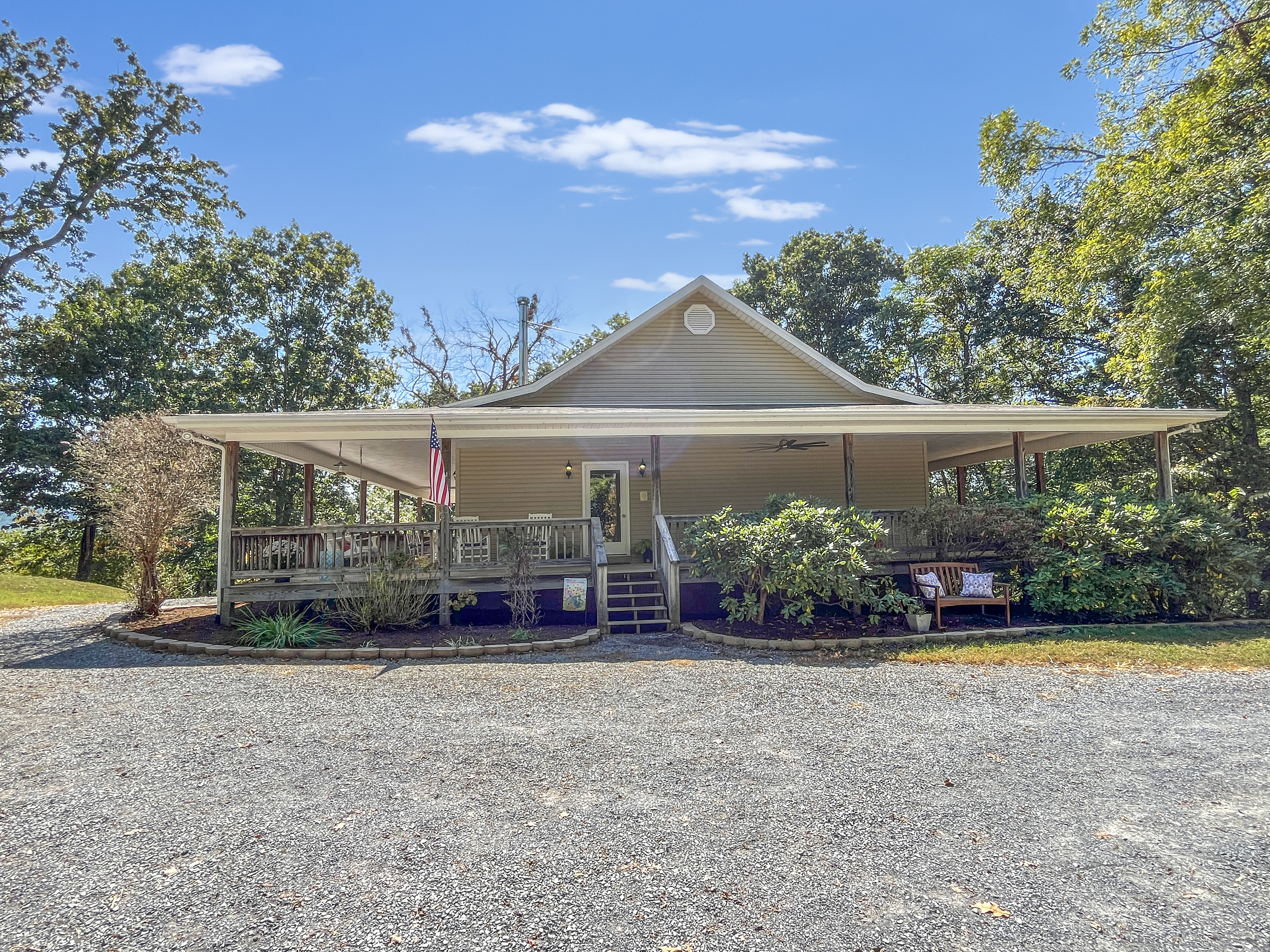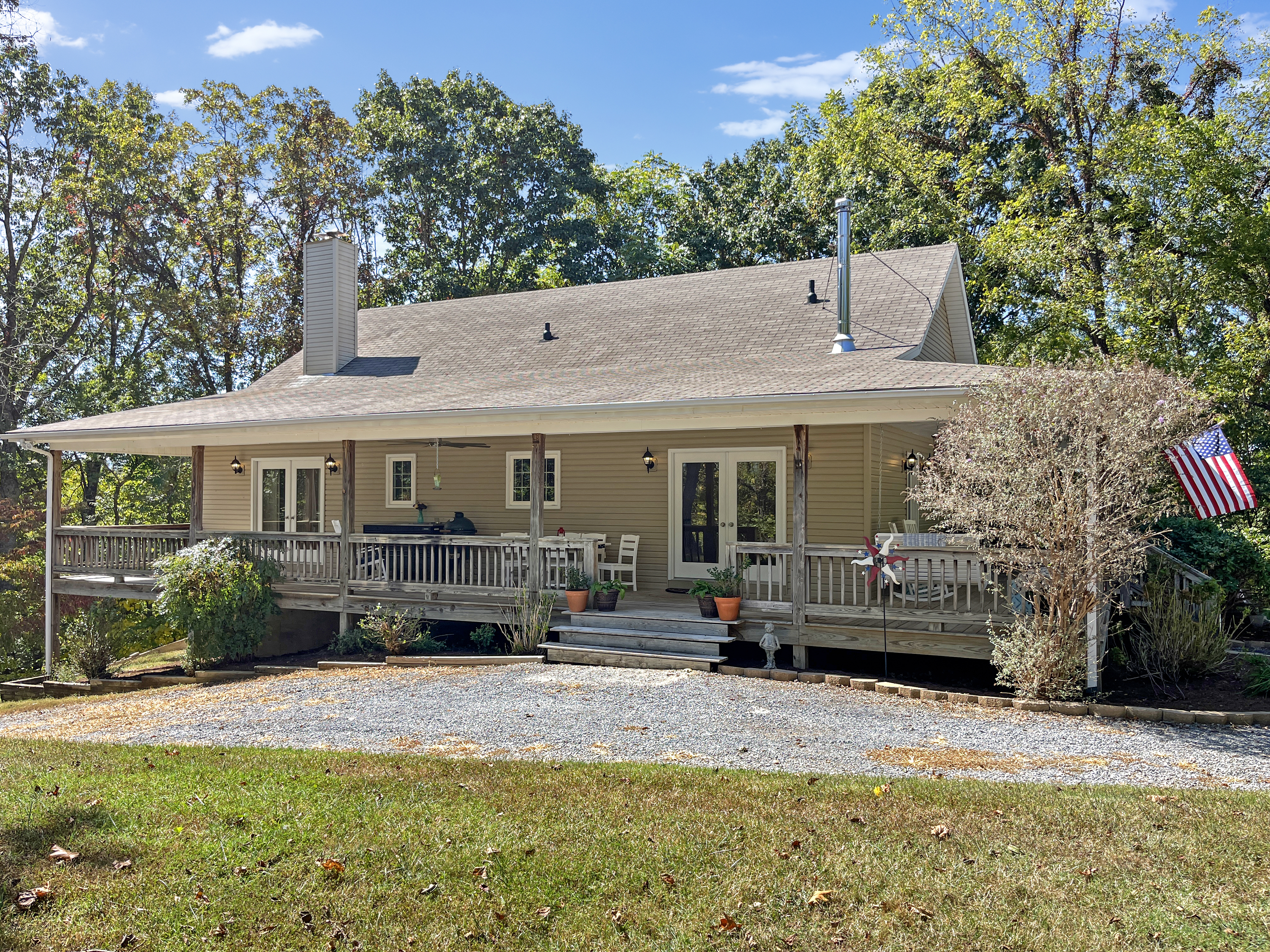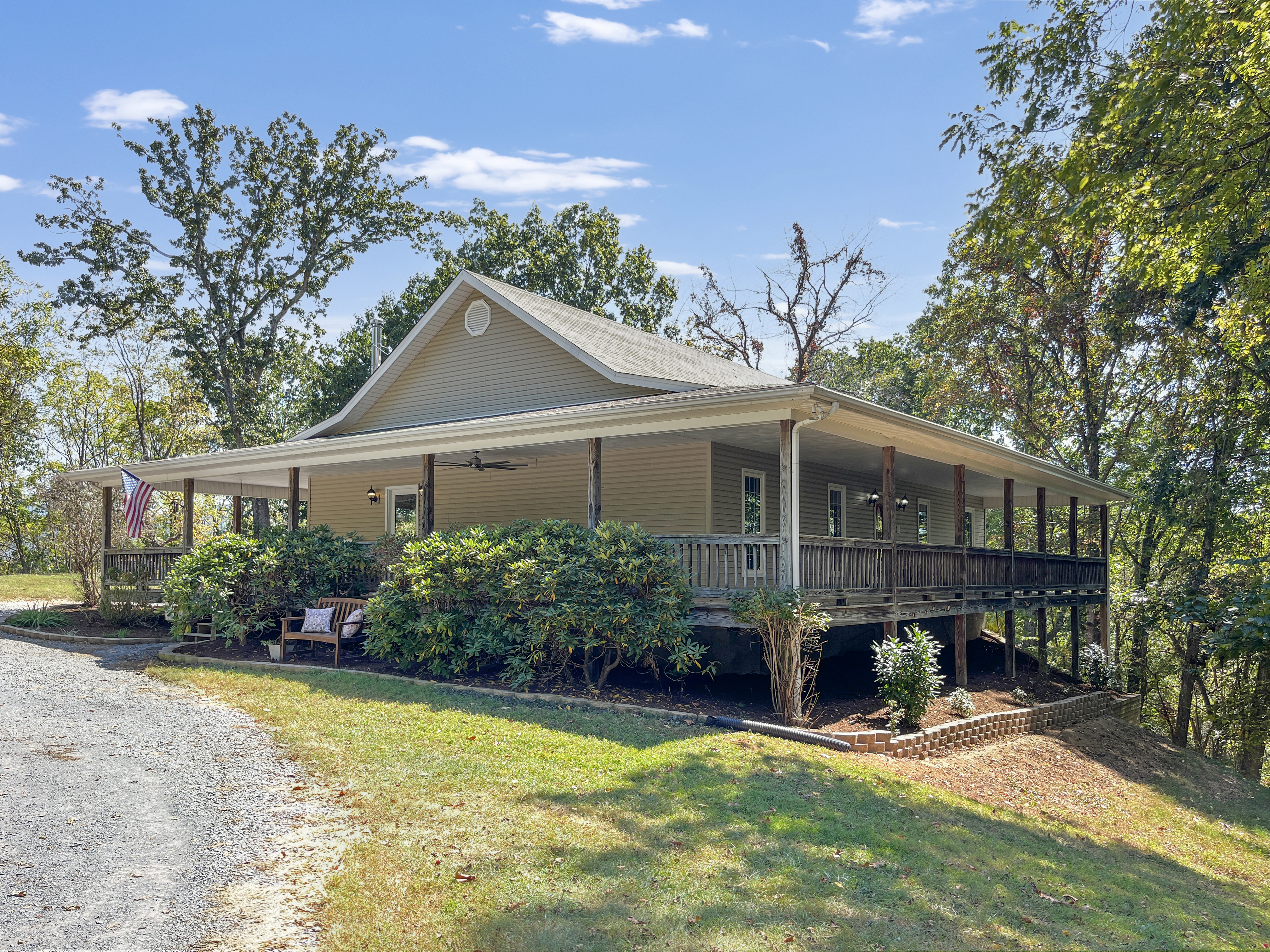 Live among the trees at High Knoll Retreat! Set atop a 1,200 ft high sugar loaf knoll, this meticulously maintained home on 7.22 acres includes a large equipment shed/barn and extra storage shed. Inside, gleaming oak floors flow from the kitchen through the great room and dining area, creating flexible space for various seating arrangements. The kitchen features a sizable island, double wall ovens, and a full appliance suite, opening onto a sunny breakfast nook with a wood stove and French door access to the wrap around porch. Adjacent is a half bath and a bedroom plumbed for a washer dryer, allowing easy one level living. At the opposite end, the primary suite offers abundant natural light, double French doors to the porch, a second wood stove, two closets, and ensuite bath