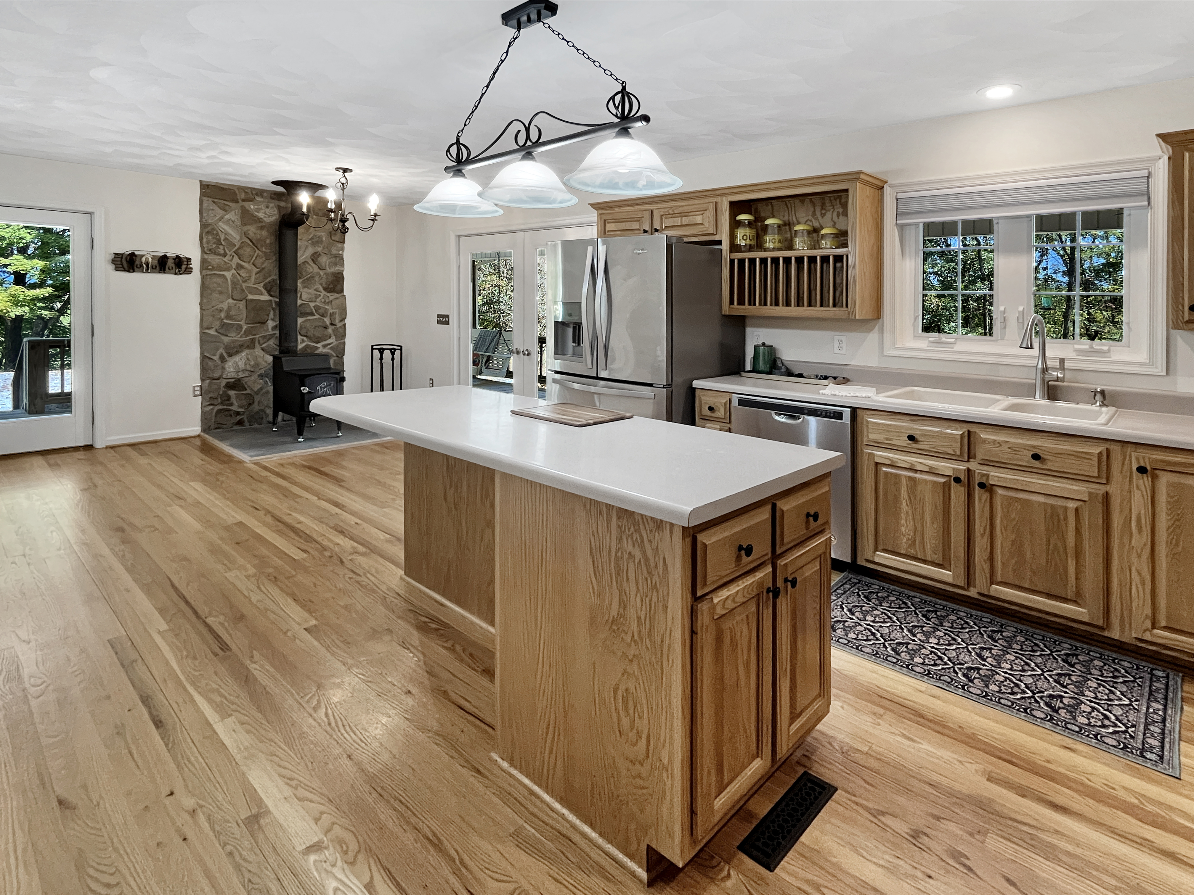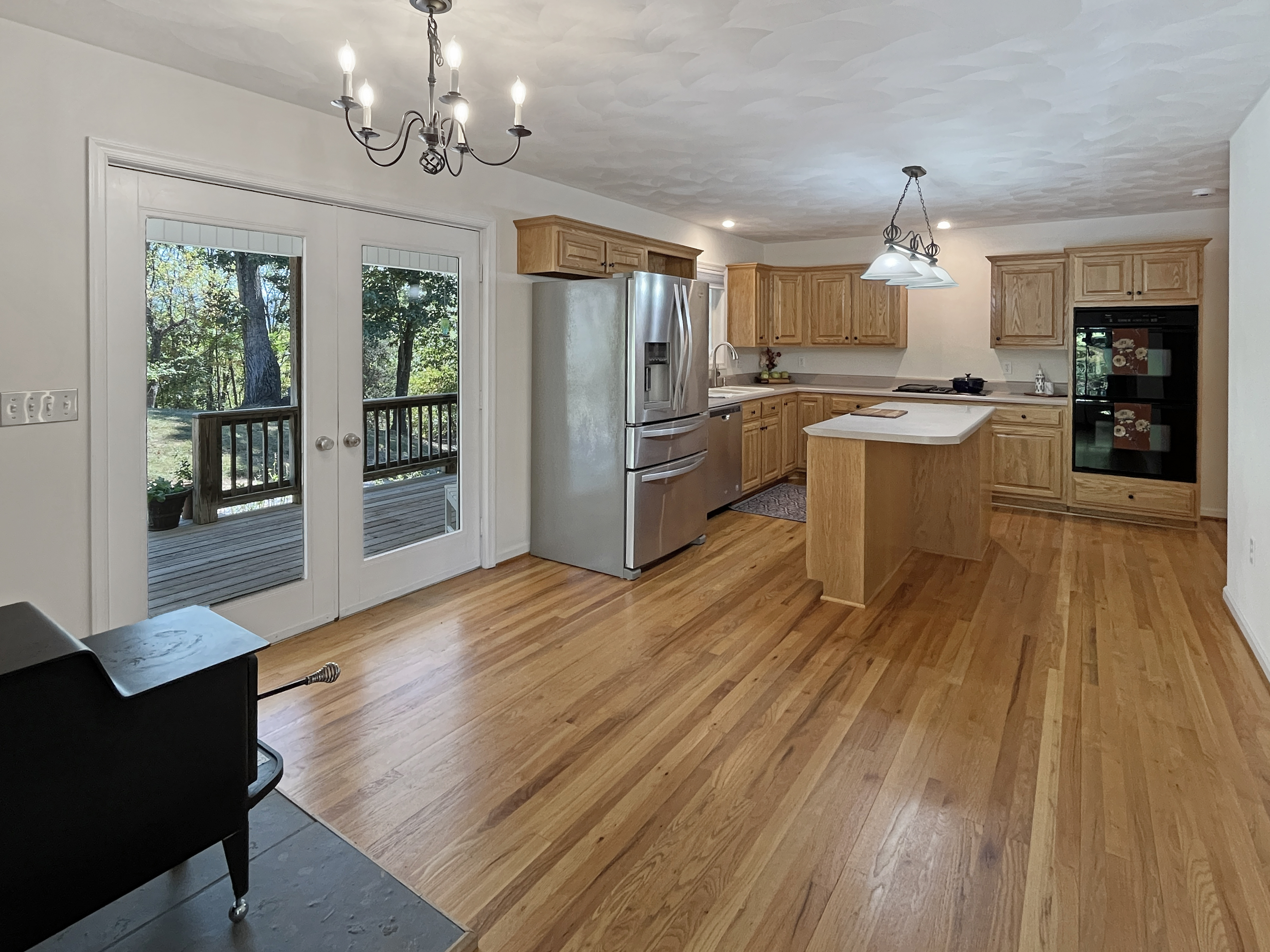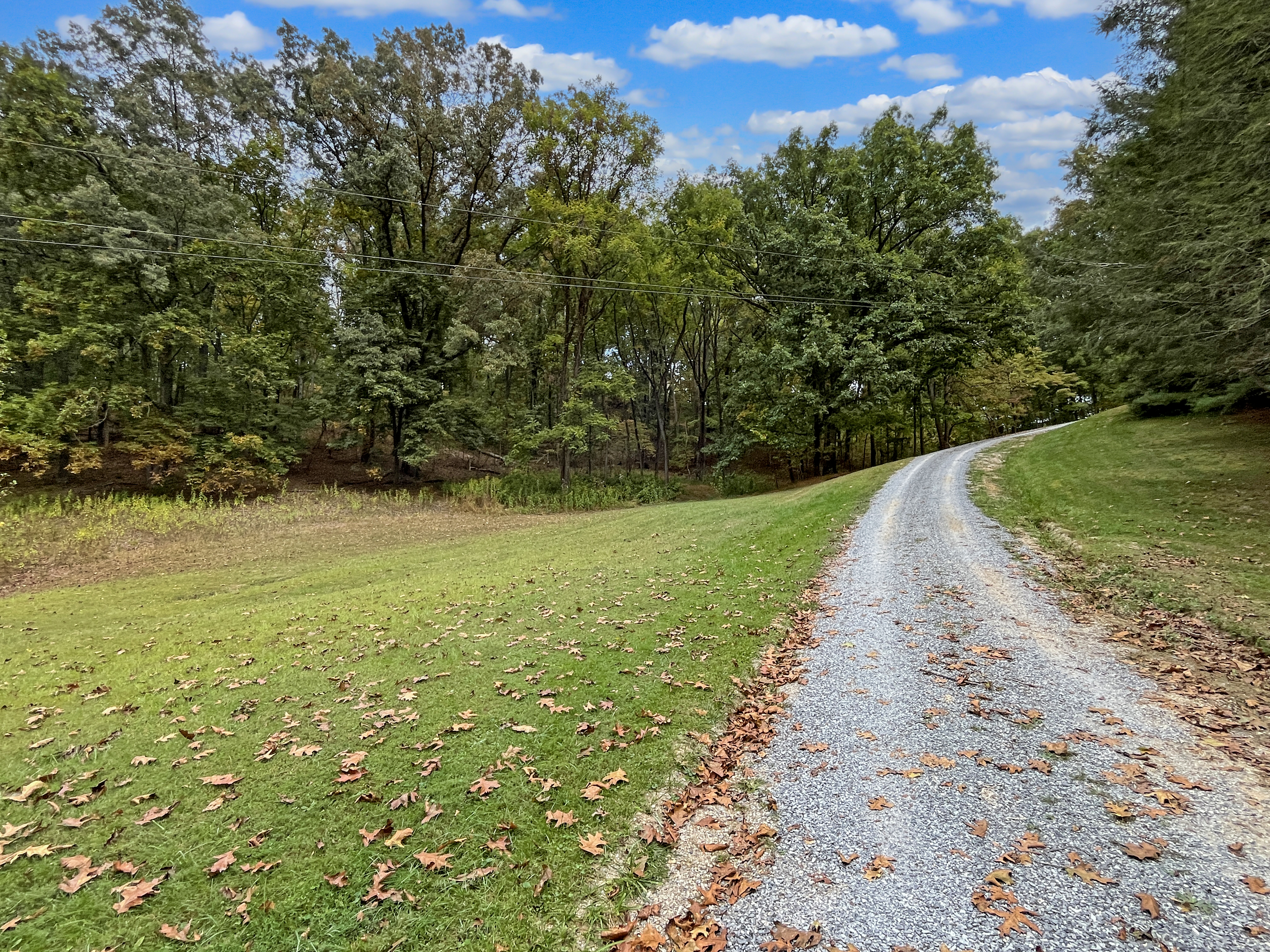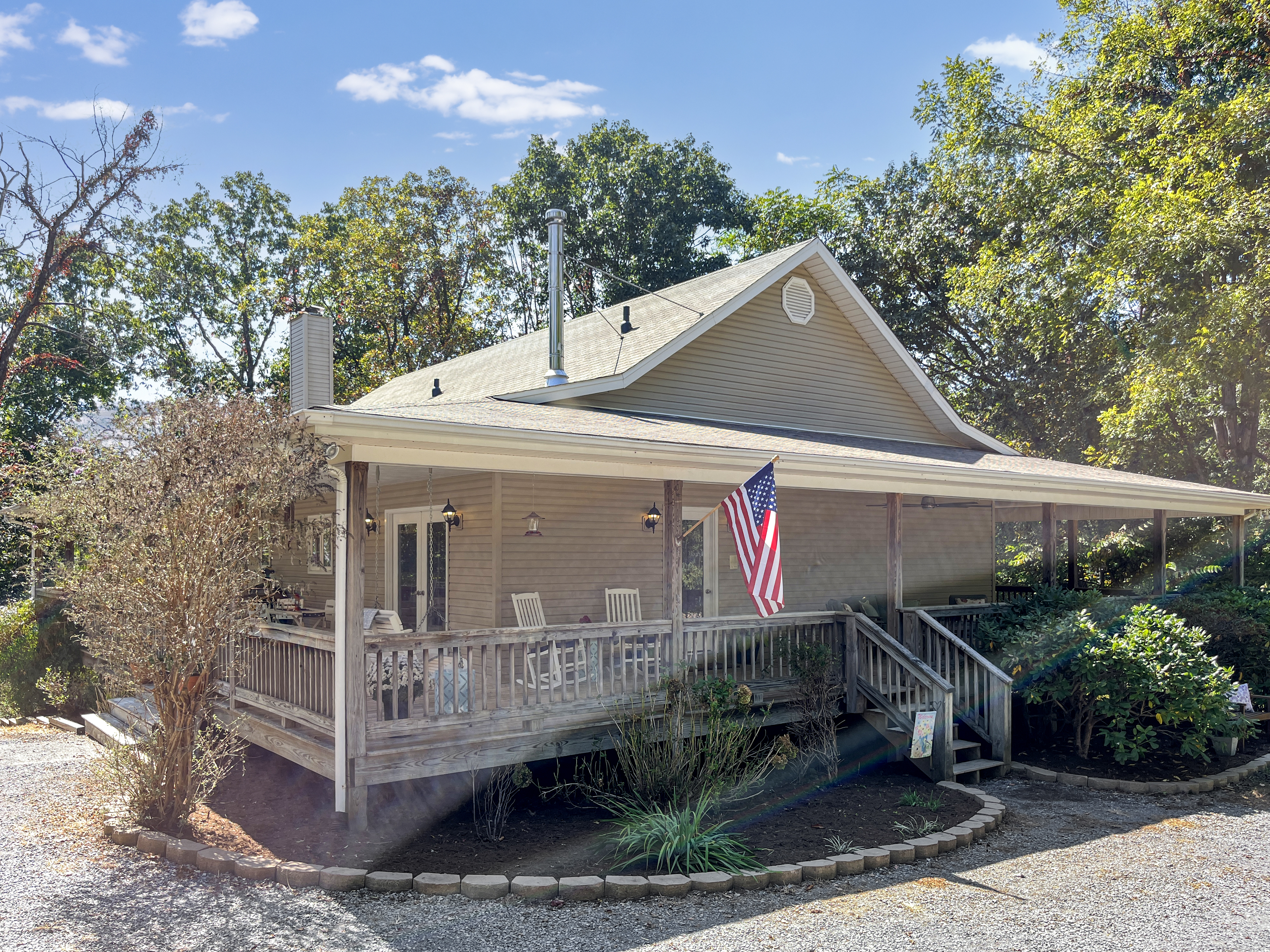 Live among the trees at High Knoll Retreat! Set atop a 1,200 ft high sugar loaf knoll, this meticulously maintained home on 7.22 acres includes a large equipment shed/barn and extra storage shed. Inside, gleaming oak floors flow from the kitchen through the great room and dining area, creating flexible space for various seating arrangements. The kitchen features a sizable island, double wall ovens, and a full appliance suite, opening onto a sunny breakfast nook with a wood stove and French door access to the wrap around porch. Adjacent is a half bath and a bedroom plumbed for a washer dryer, allowing easy one level living. At the opposite end, the primary suite offers abundant natural light, double French doors to the porch, a second wood stove, two closets, and ensuite bath