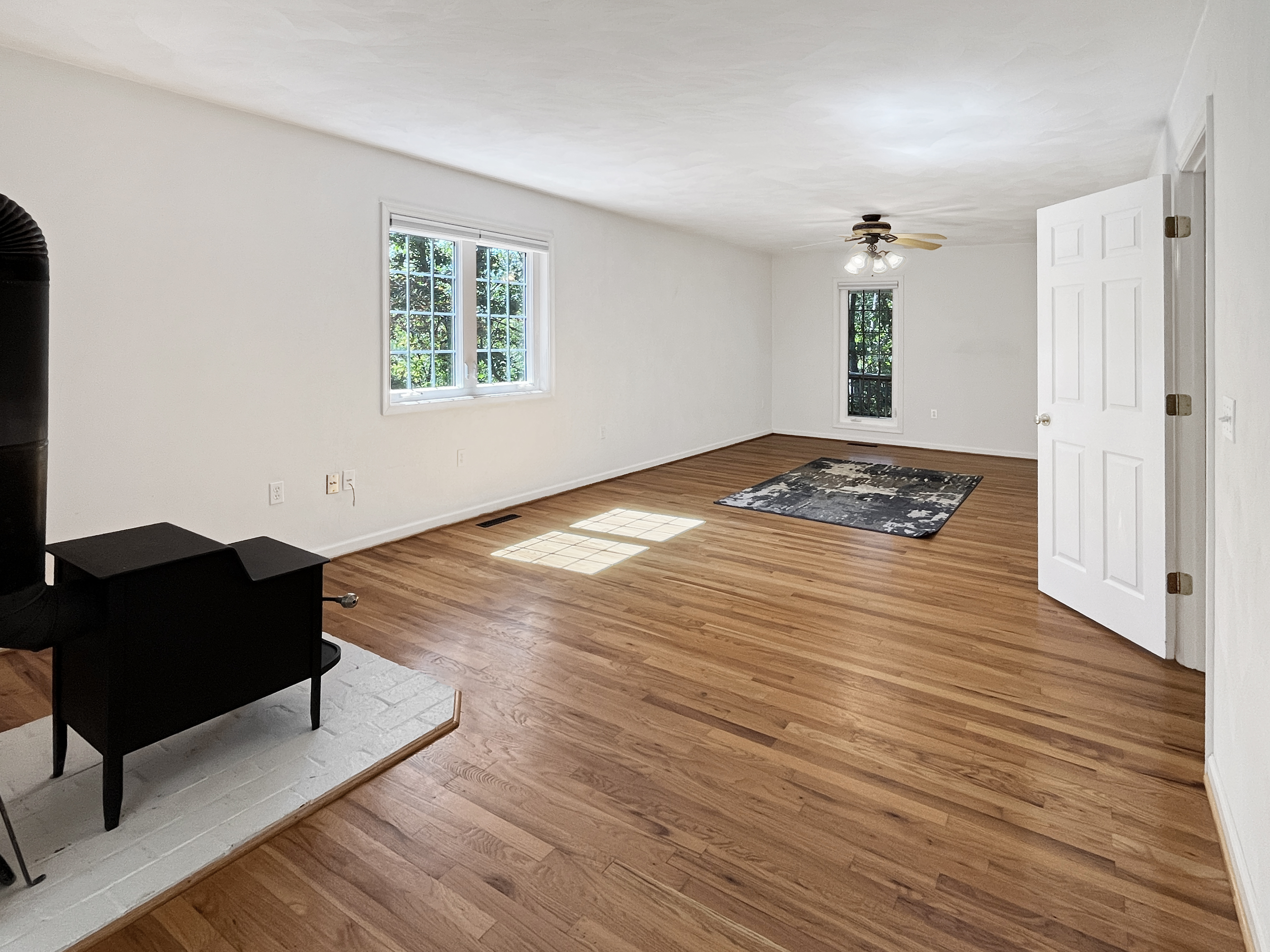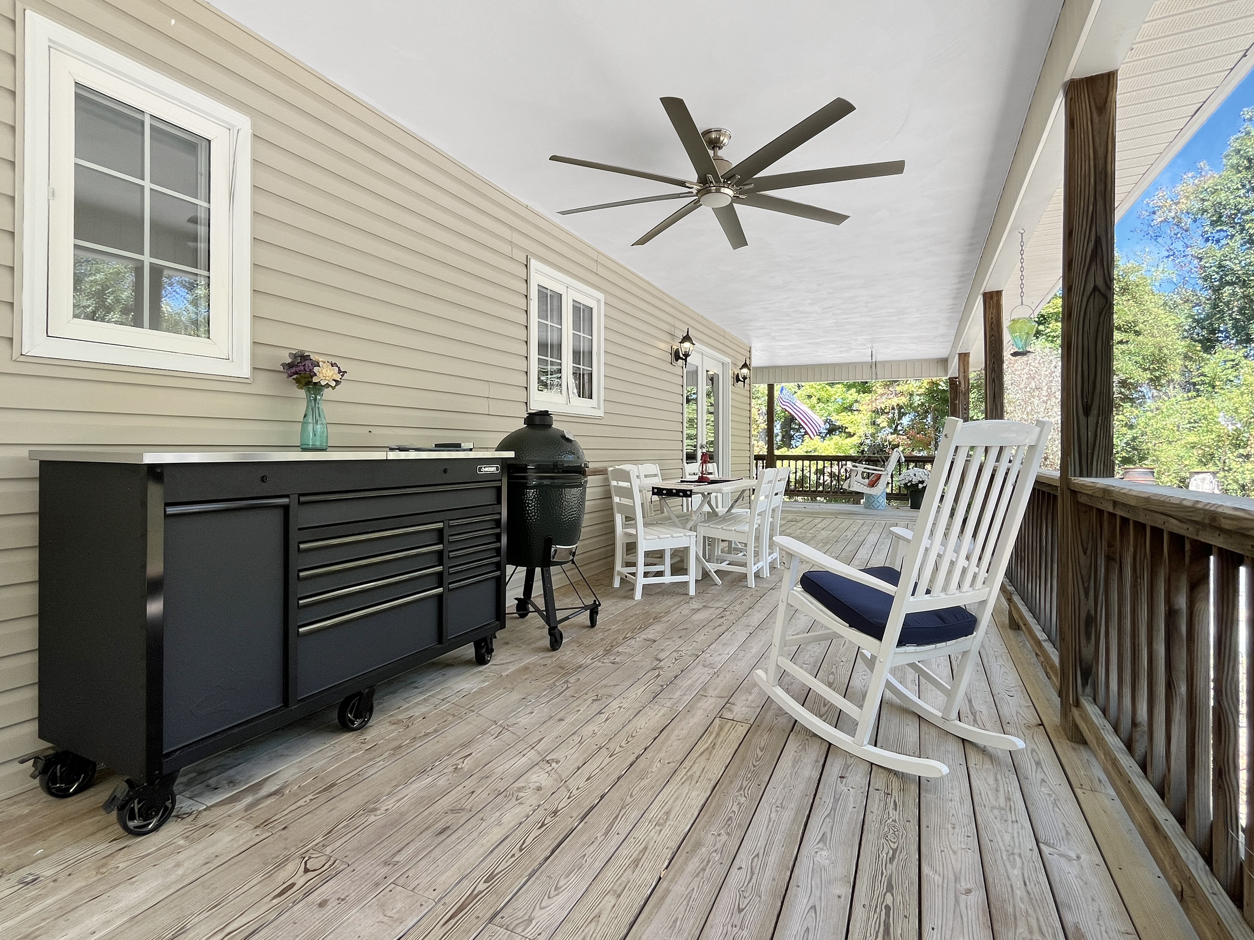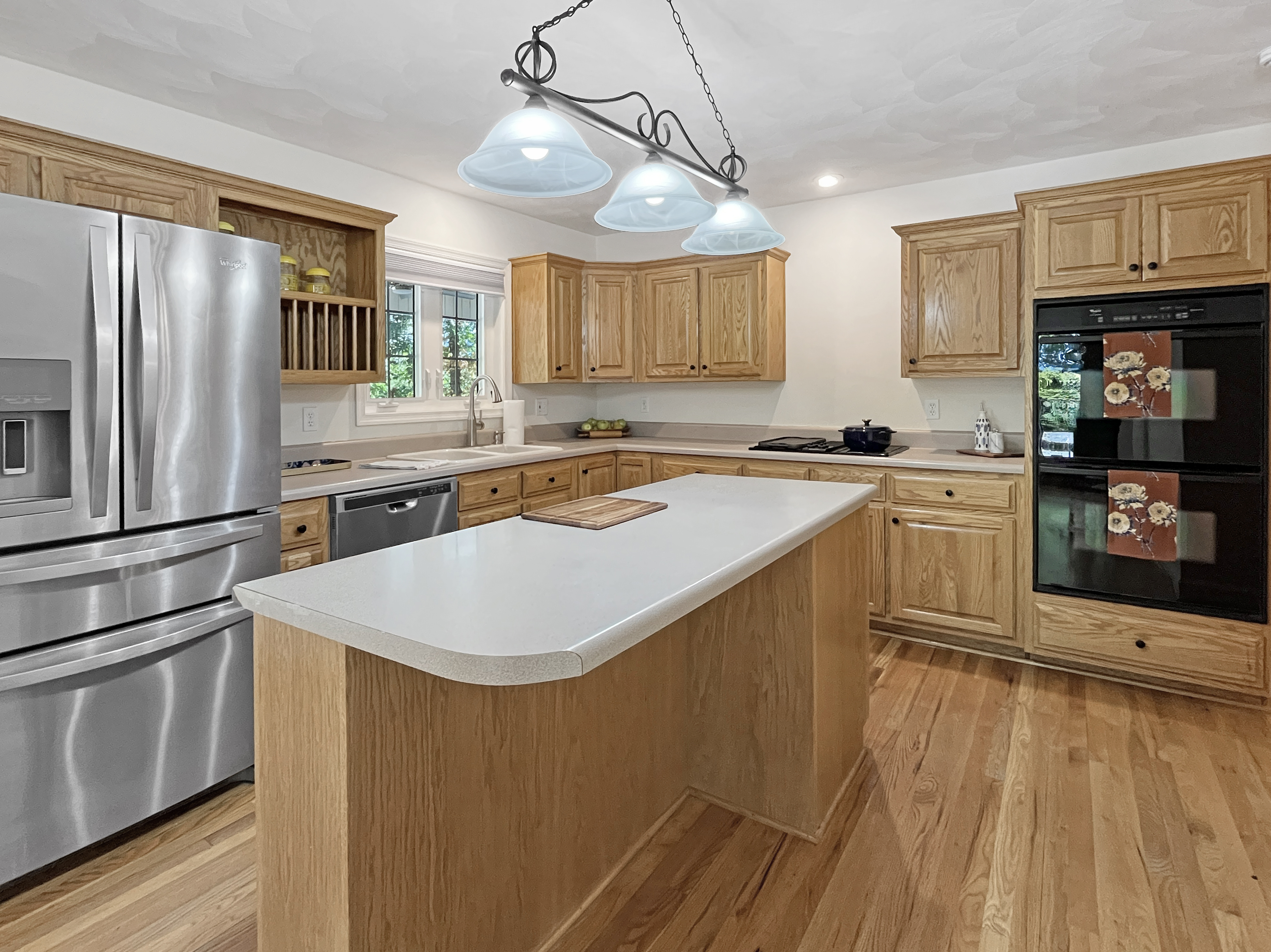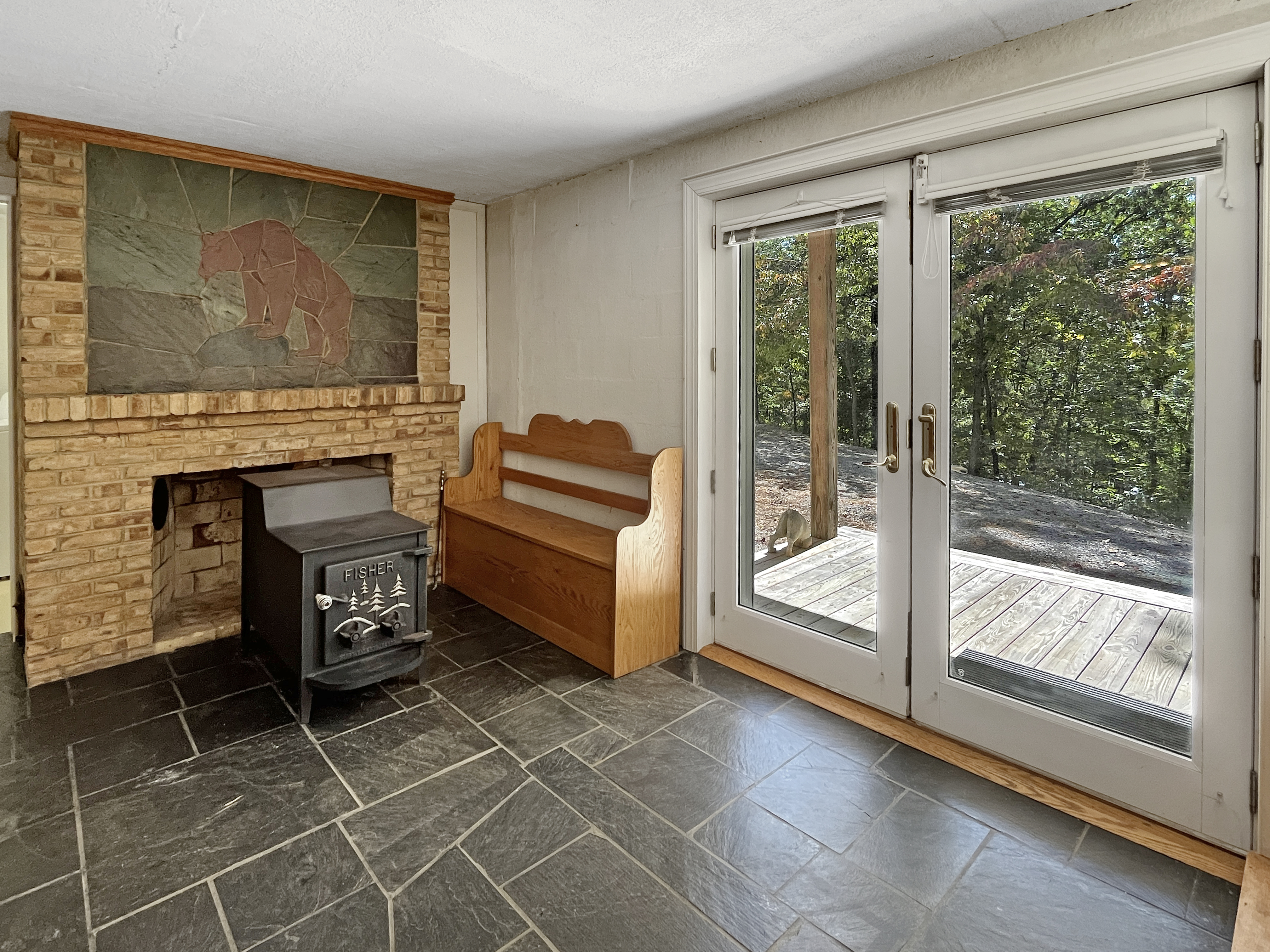 Live among the trees at High Knoll Retreat! Set atop a 1,200 ft high sugar loaf knoll, this meticulously maintained home on 7.22 acres includes a large equipment shed/barn and extra storage shed. Inside, gleaming oak floors flow from the kitchen through the great room and dining area, creating flexible space for various seating arrangements. The kitchen features a sizable island, double wall ovens, and a full appliance suite, opening onto a sunny breakfast nook with a wood stove and French door access to the wrap around porch. Adjacent is a half bath and a bedroom plumbed for a washer dryer, allowing easy one level living. At the opposite end, the primary suite offers abundant natural light, double French doors to the porch, a second wood stove, two closets, and ensuite bath