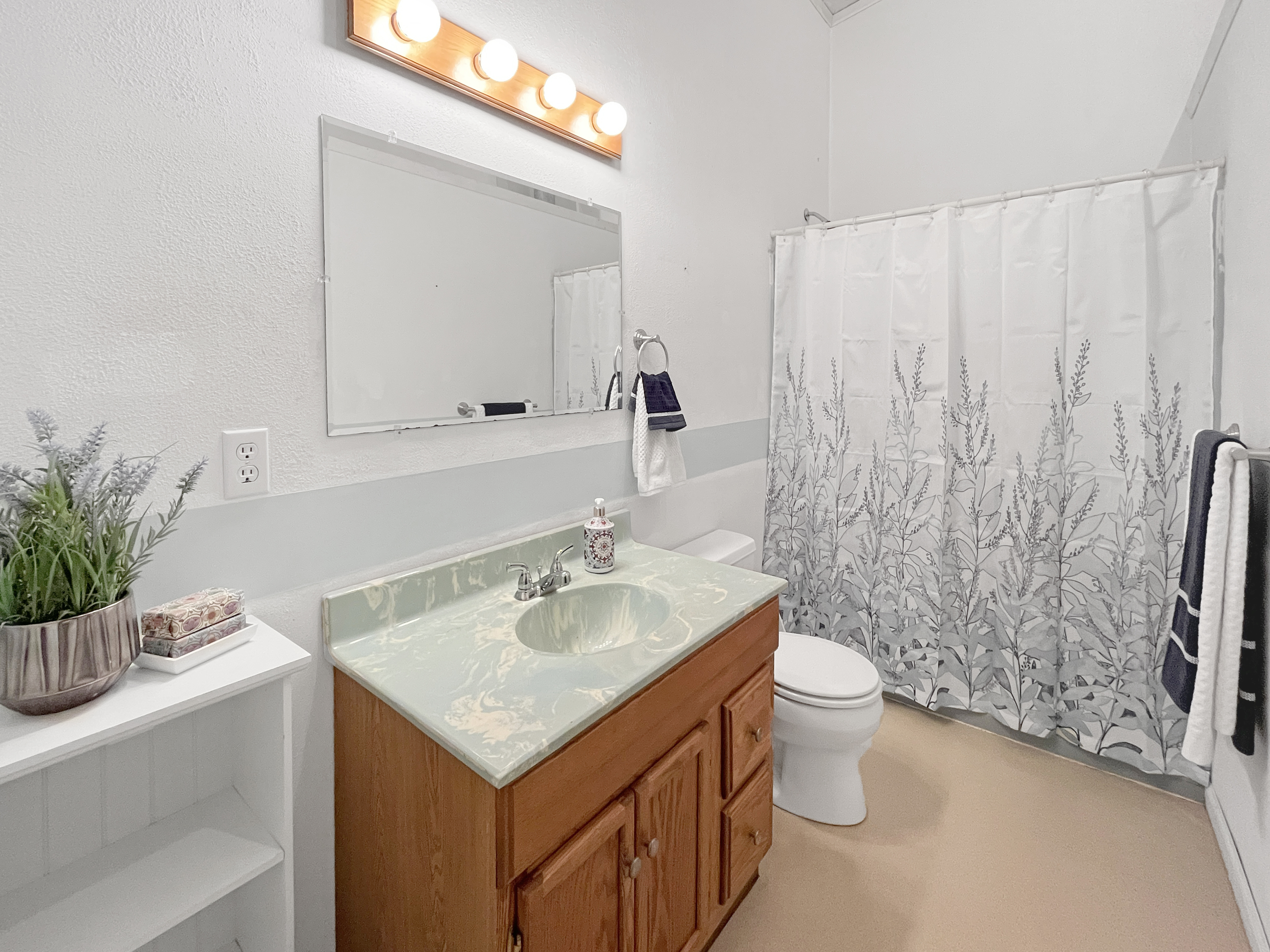 with a low threshold tiled shower and dual vanities. Oversized crank out windows frame stunning forest views throughout the main level.